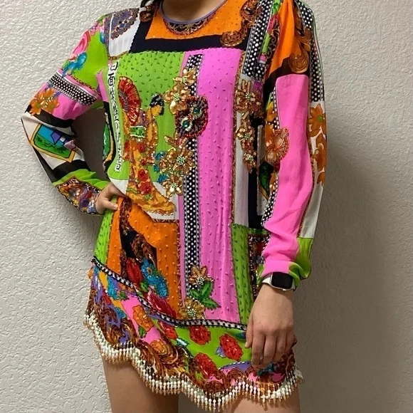Diane Freis 100% Silk Beautifully Beaded Chinese print Mini DressSize: This Stunning long sleeve silk dress has intricate beading throughout the dress with a fringe of beading along the hem line. It has a round neckline with a key hole and two button closure in back. It is in excellent pre owned condition.