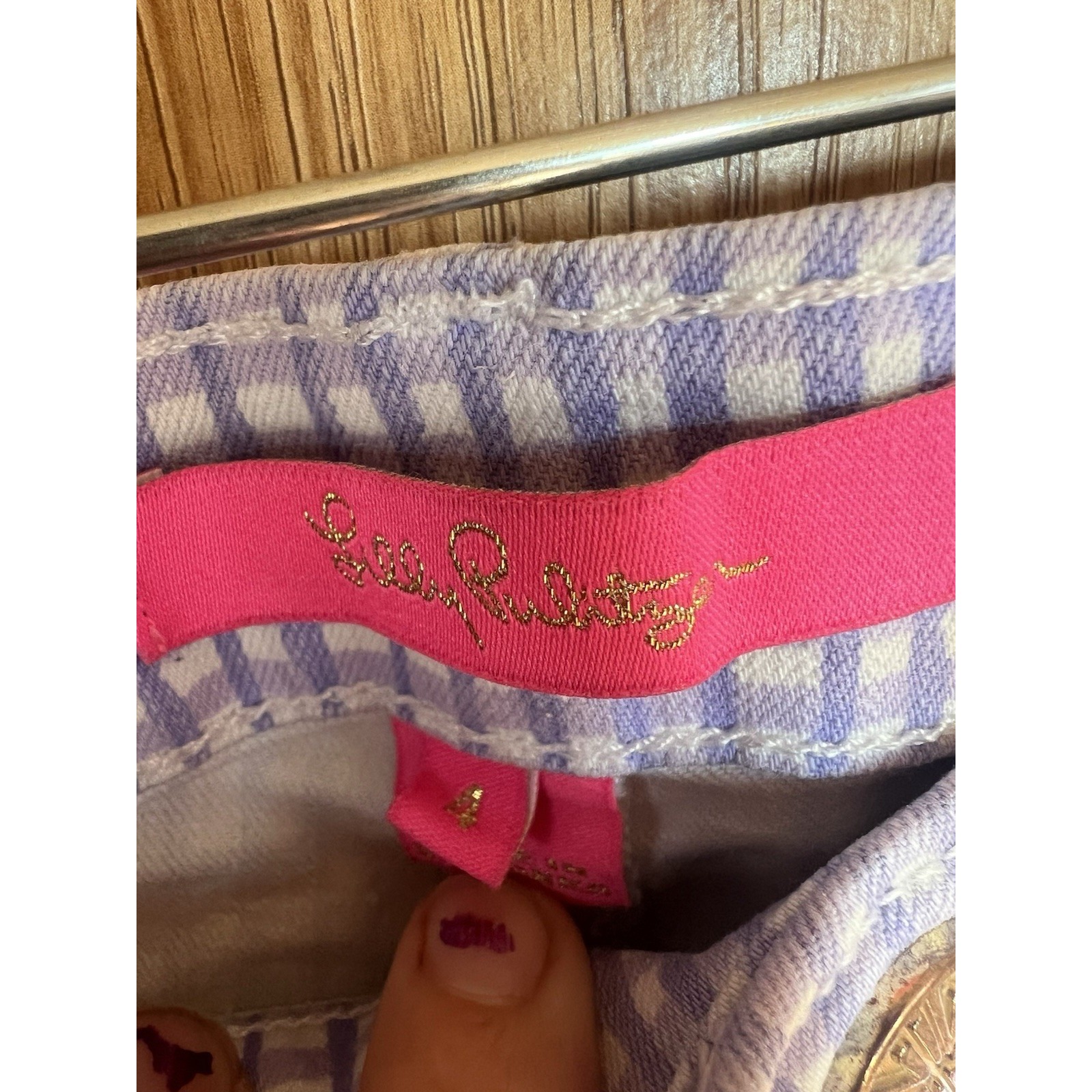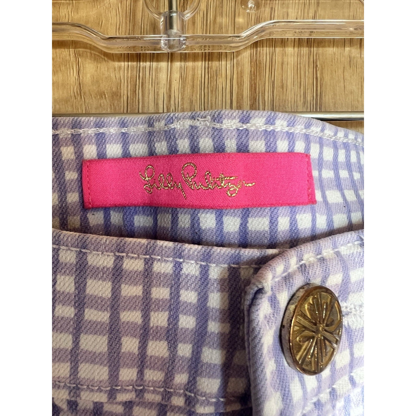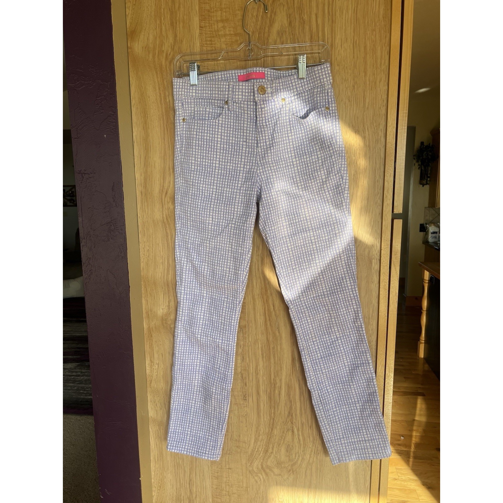 The Lilly Pulitzer South Ocean Mid Rise Pants in Purple White Gingham Slim Stretch size 4 are a stylish addition to any woman's wardrobe. Made from a comfortable cotton blend denim fabric, these pants feature a zip and button closure, mid-rise fit, and stretch for added comfort. The gingham pattern and slim, skinny style make them perfect for a beachy, nautical, or coastal-themed outfit. With accents like buttons and the Lilly Pulitzer logo, these pants exude a playful and preppy vibe, ideal for resort wear or a casual day out.